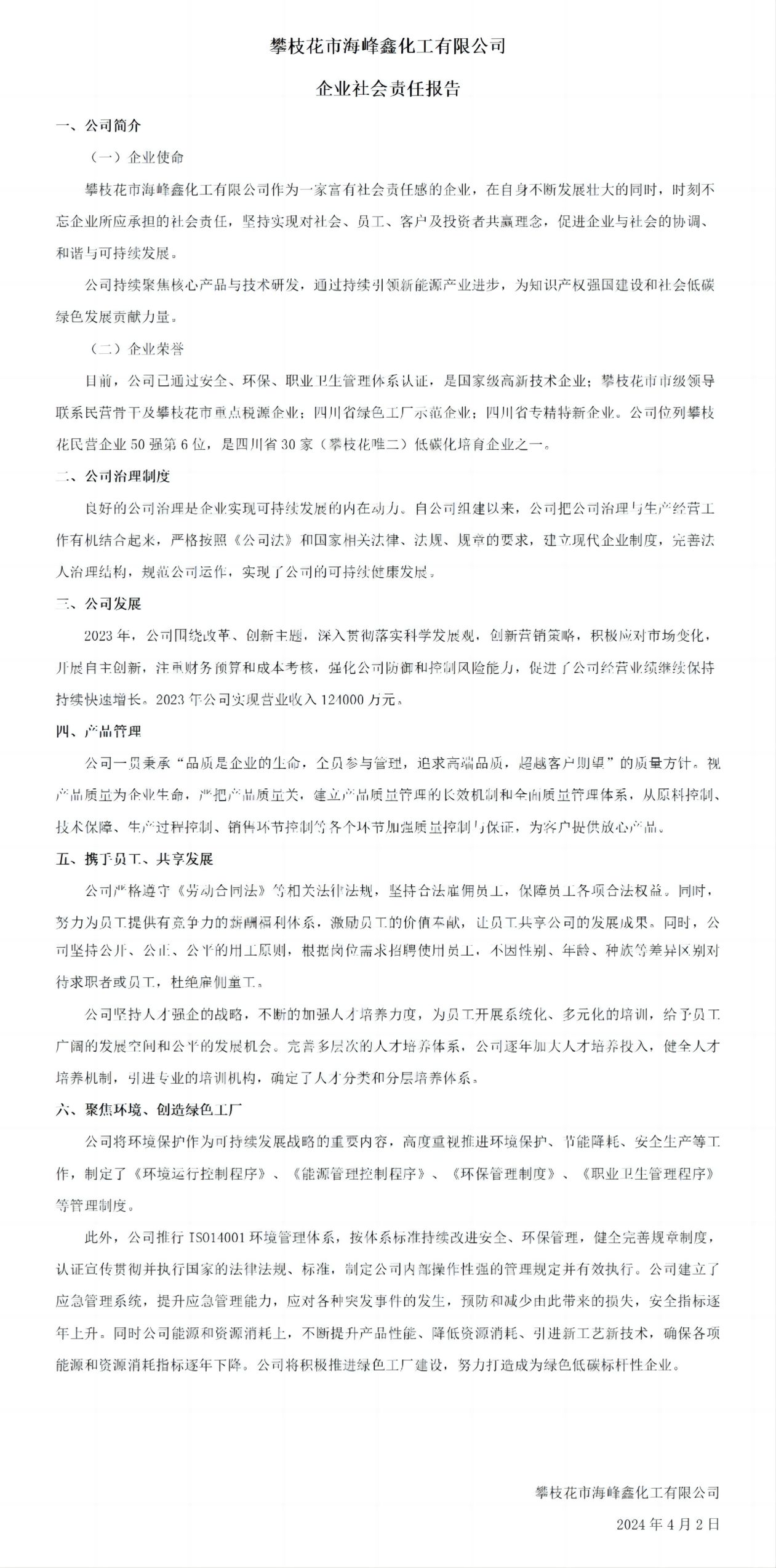 攀枝花市海峰鑫化工有限公司社會(huì)責(zé)任報(bào)告